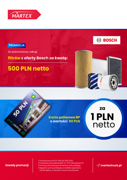 BOSCH: ZA JEDNORAZOWY ZAKUP FILTRÓW Z OFERTY BOSCH ZA KWOTĘ 500 PLN NETTO - KARTA PALIWOWA BP O WARTOŚCI 50 PLN ZA 1 PLN NETTO